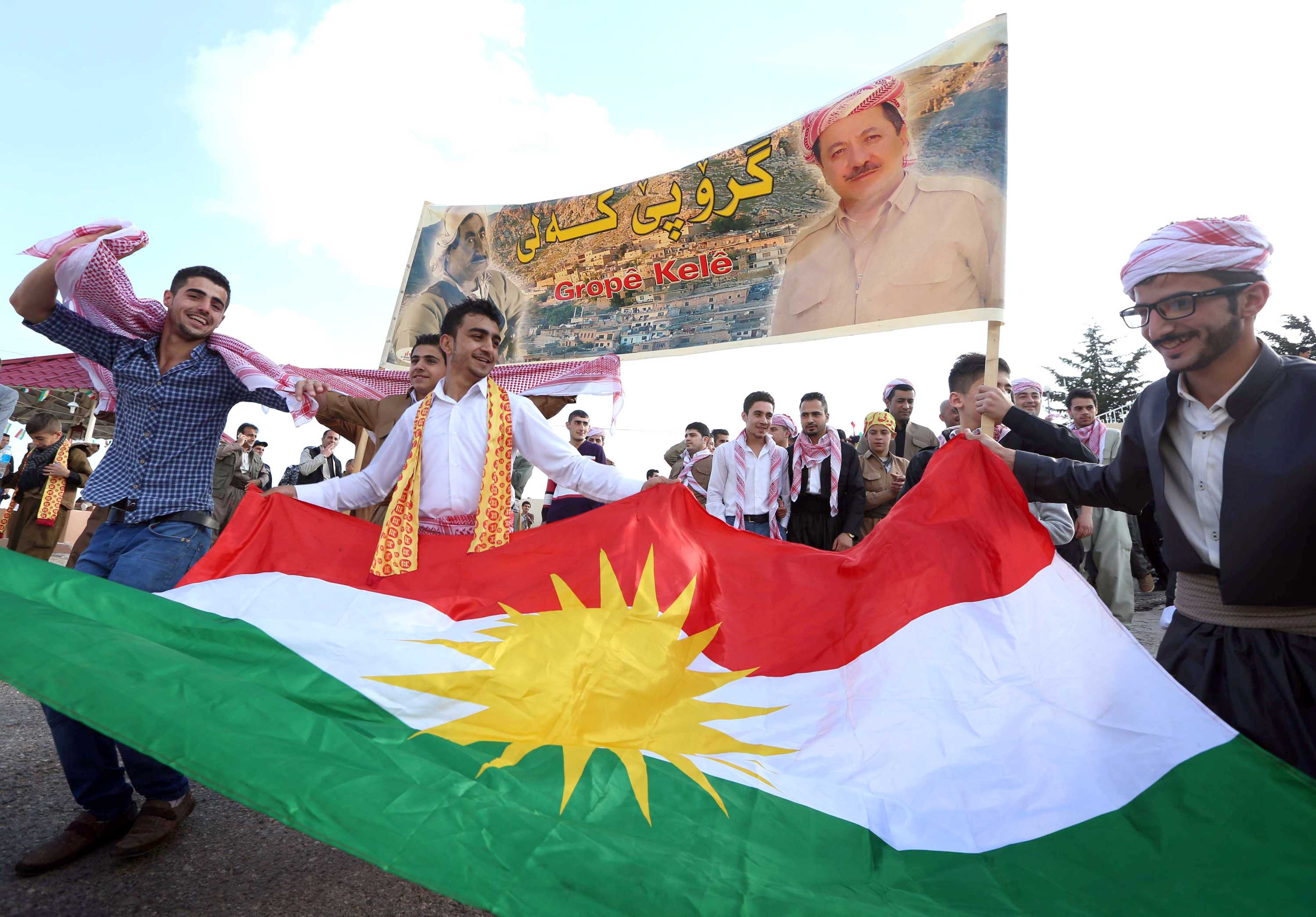 Iraqi Kurds dressed in traditional clothing hold the Kurdish flag and a poster bearing the portrait of Kurdistan's regional president Masoud Barzani as they celebrate the Noruz spring festival in the town of Akra on March 20, 2014.